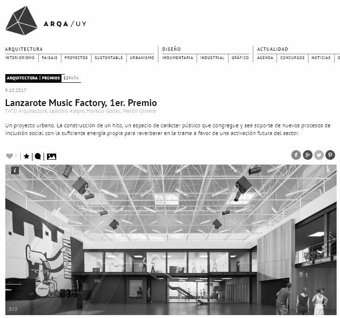 1er Premio Concurso Internacional Lanzarote Music Factory. Confección de Proyecto Básico y de Ejecución. Lanzarote, Islas Canarias, España. https://www.tatuarq.com/lanzarote