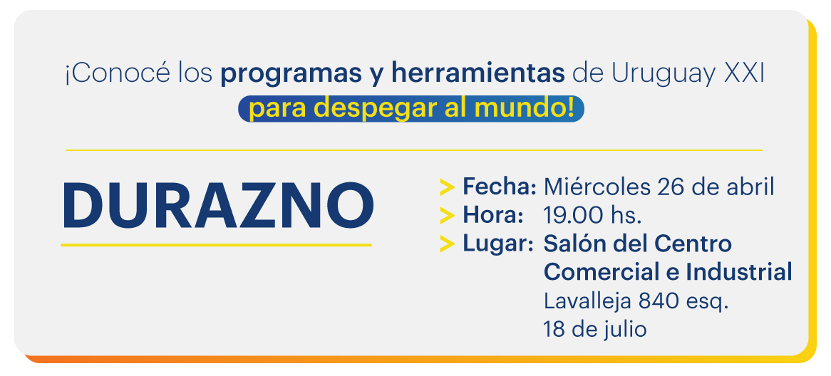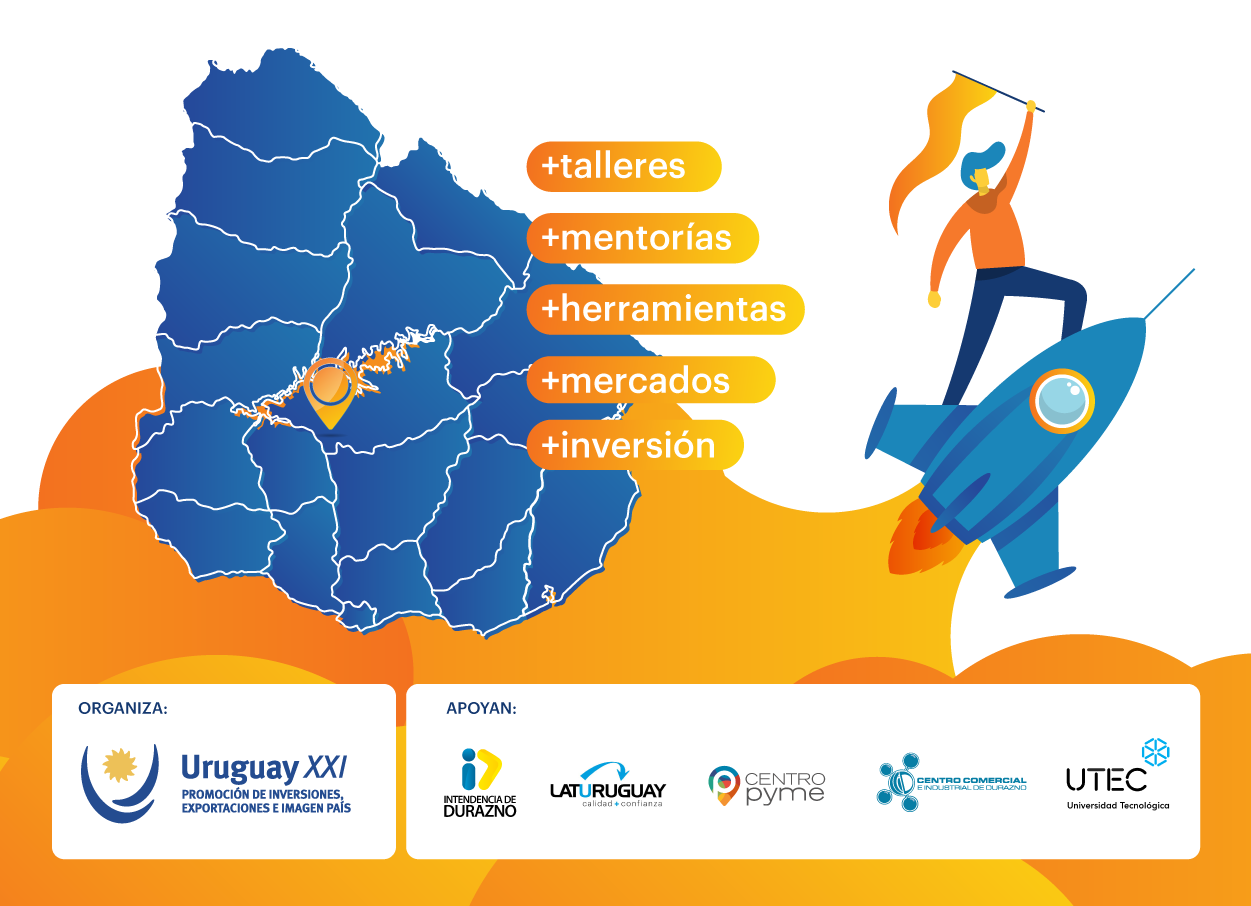 Uruguay XXI invita a empresarios y a emprendedores de Durazno a participar de su ciclo de talleres y mentorías “MÁS COMERCIO. Más mercados. Más inversión”.